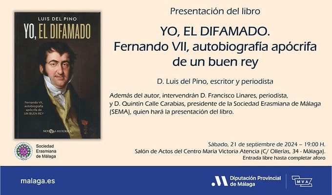 El próximo sábado 21 de septiembre estaré en Málaga, para hablar de ‘Yo, el Difamado’, mi «autobiografía» de Fernando VII. Muchas gracias a D. Quintín Calle, presidente de la Sociedad Erasmiana, y a mi buen amigo D. Paco Linares por presentar el acto.